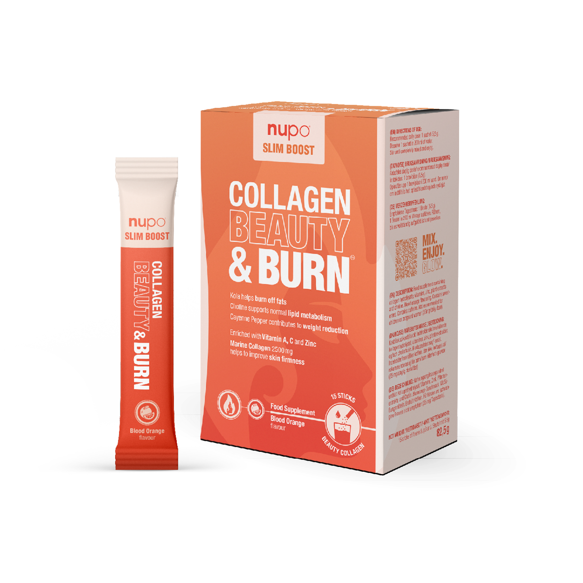 Collagen Beauty & Burn vsebuje kombinacijo vitaminov, mineralov in skrbno izbranih rastlinskih izvlečkov. Uživanje dopolnila Slim Boost Collagen Beauty & Burn, ki je kombinacija morskega kolagena in topilca maščob, lahko uporabnikom nudi več koristi: pospešuje vaš proces hujšanja s pomočjo rastlinskih izvlečkov. Kola pomaga pri razgradnji maščobnega tkiva, medem ko guarana in kajenski poper prispevata k izgubi telesne teže. Poleg tega prejmete z zaužitjem enega odmerka 2500 mg kolagena iz morskih virov, ki prispeva k lepšemu videzu kože.