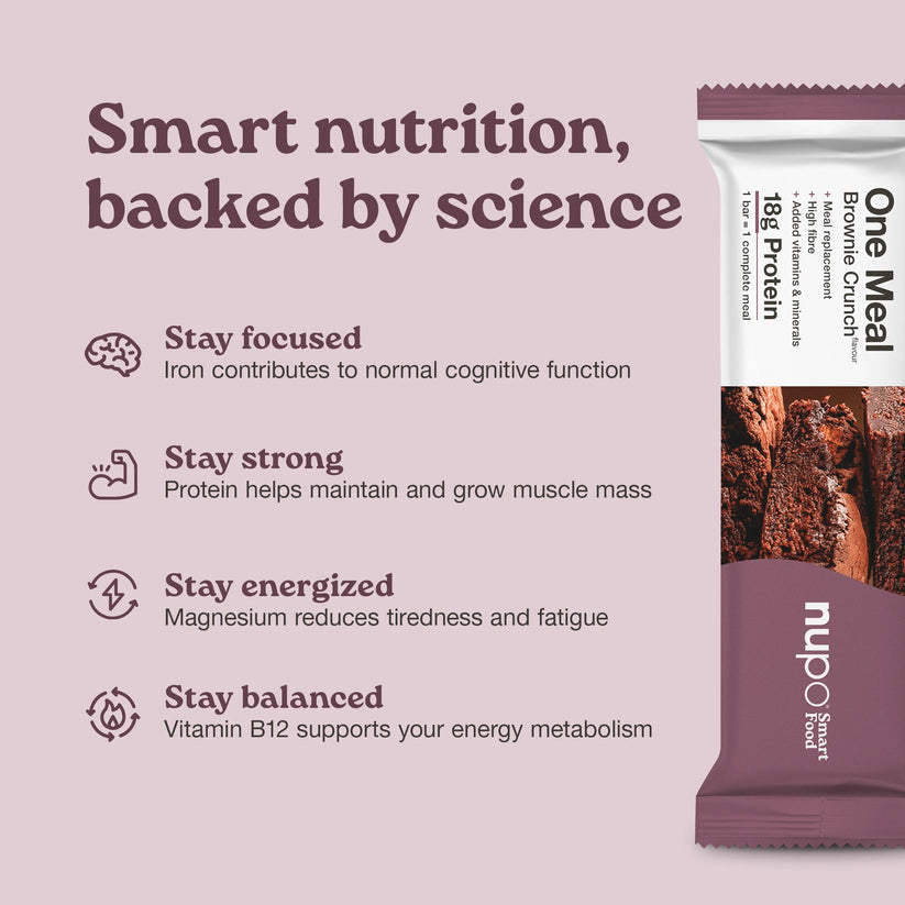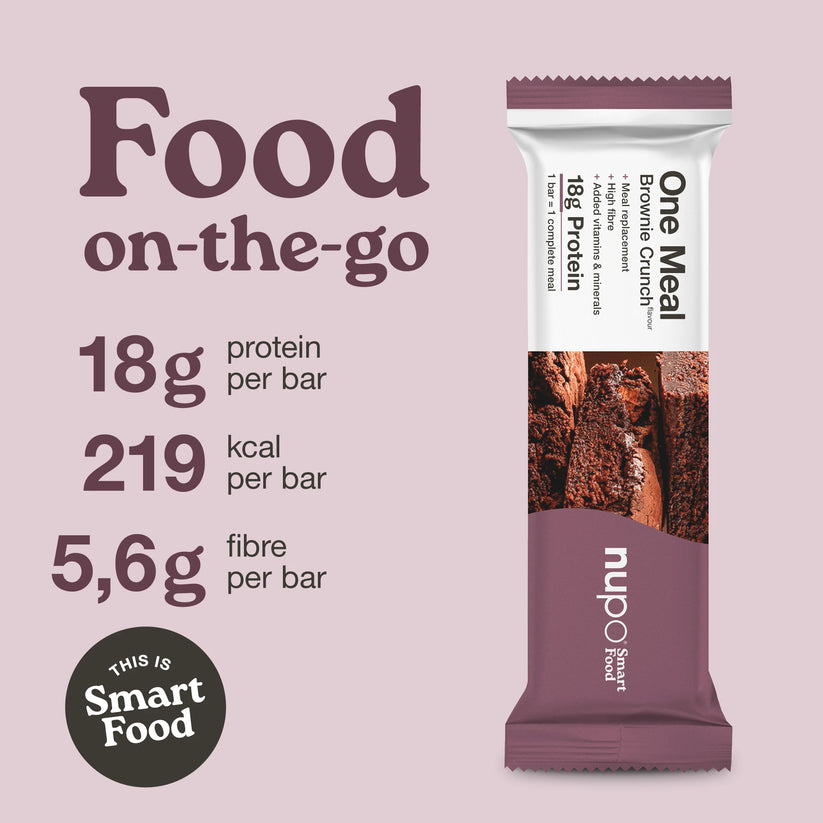 Ploščica One Meal Brownie Crunch vam ponuja okus bogatega čokoladnega brownija kot popolno nadomestilo obroka. Visoka vsebnost beljakovin in vlaknin, obogatena z vitamini, minerali in linolno kislino – vse v samo 219 kcal.