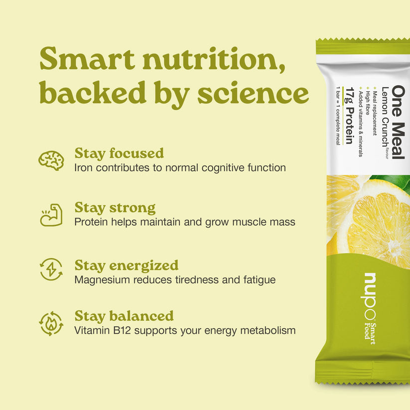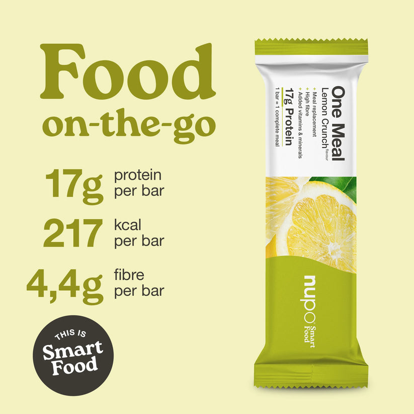 Ploščica Lemon Crunch za en obrok ponuja izbruh naravnega okusa limone, zavitega v gladko jogurtovo prevleko s hrustljavo sojino hrustljavostjo. Polna je 17 g beljakovin, vlaknin, vitaminov in mineralov, zato je lahka, a nasitna možnost s samo 217 kcal.
