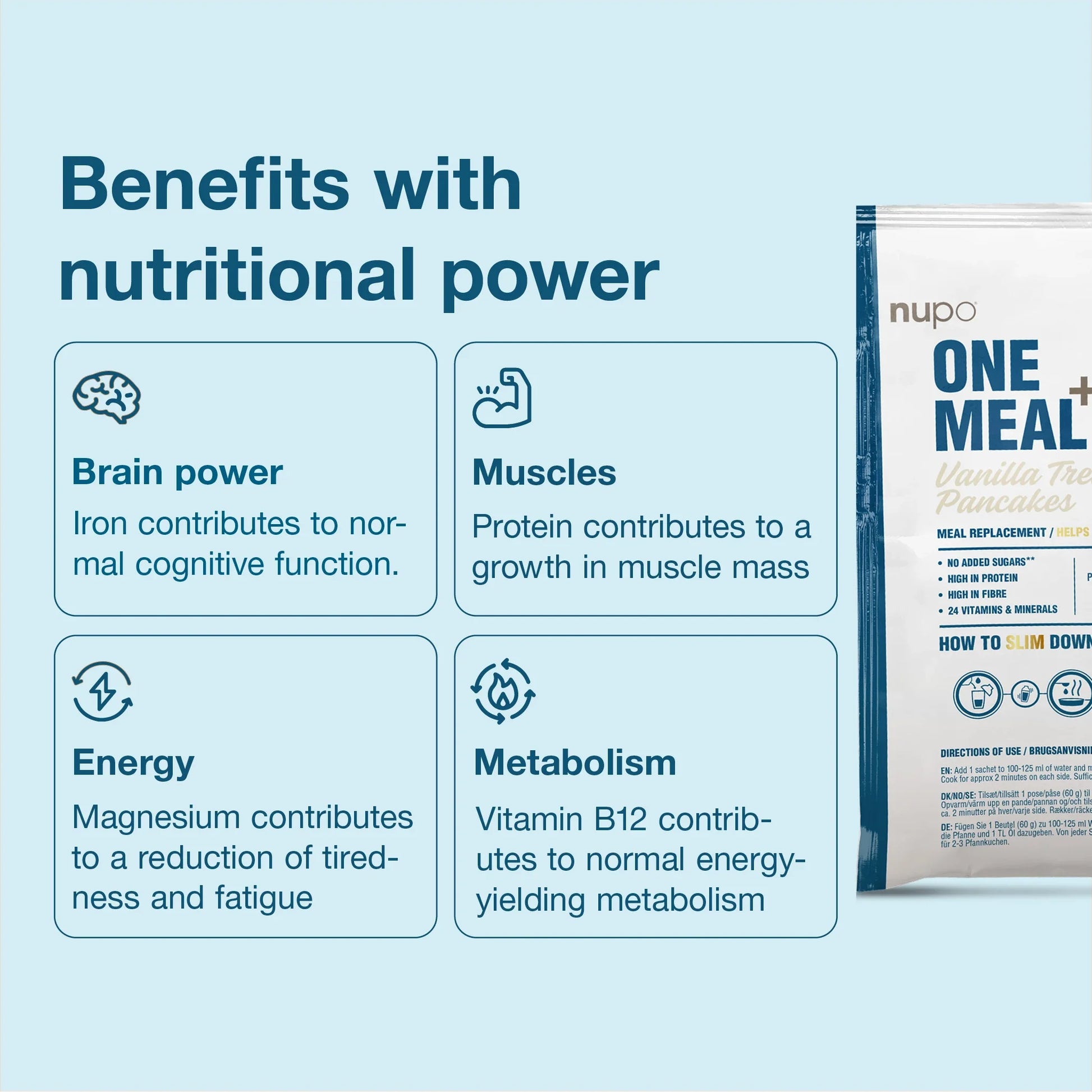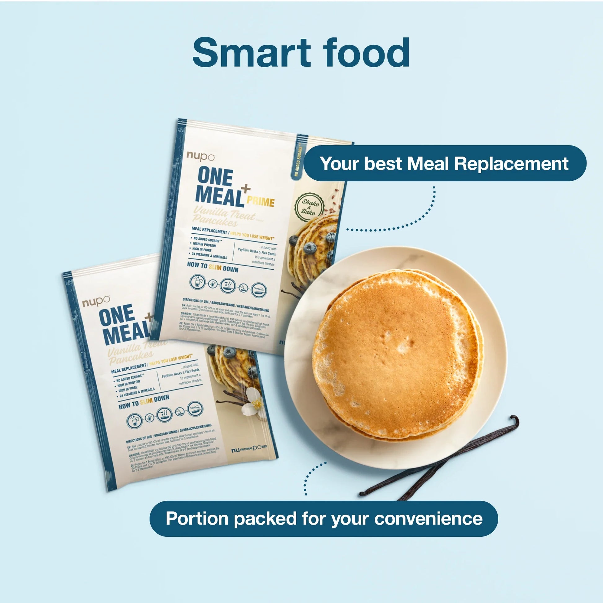 Nupo One Meal +Prime palačinke z okusom vanilije so nadomestilo obroka v obliki pripravljene zmesi za palačinke v prahu, ki je namenjeno uporabo v energijsko omejenih dietah z vitamini in minerali za nadomestilo posameznega dnevnega obroka hrane. Ne vsebuje dodanih sladkorjev. Vsebuje le naravno prisotne sladkorje. To nadomestilo obroka je sestavljeno iz izjemne mešanice visokokakovostnih mlečnih in jajčnih beljakovin z vsemi esencialnimi aminokislinami, bogato pa je tudi z vlakninami iz ovsa. Poleg tega pa vsebuje tudi semena psylliuma in lanena semena – naravne vlaknine, ki prispevajo k večji hranljivosti. +Prime palačinke pa ne vsebujejo le veliko beljakovin in vlaknin, temveč vam v enem obroku zagotavljajo tudi 24 esencialnih vitaminov in mineralov ter esencialno linolno kislino. Po drugi strani pa vsebnost kalorij znaša le približno 200 kcal.